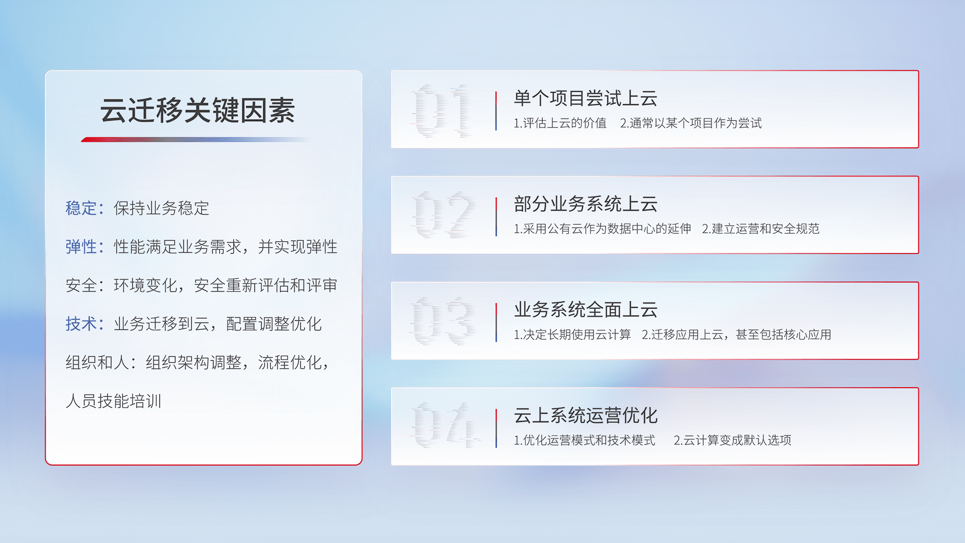 结合实际业务,,,,从规划设计、、、云平台选型、、、云原生改造、、、数据迁移、、、、集成交付,,,,迁移全过程为客户识别最佳上云路径,,,,做好风险识别管理,,设计网络架构、、、身份权限、、、安全审计合规、、操作审计、、、、日志审计、、监控告警策略、、、多站点容灾设计等,,,,对云上基础设施进行整体规划,,提升IT治理水平,,,以满足弹性、、高可用、、高性能的需求。。。
