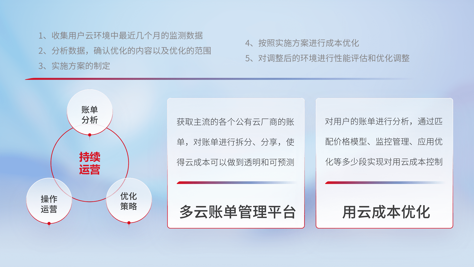 通过多云纳管,,,,以统一的资源数据模型把客户的云资源进行抽象和封装,,,,进而实现对多云资源的统一操作,,保障云资源管理的可靠性、、、稳定性与可用性。。。量身定制化运维内容,,配置、、、开发运维、、补丁管理、、、备份、、、监控、、认证和访问管理、、审计和日常巡检等,,保障在用云过程中的可靠度,,,稳定度以及高可用率。。。。